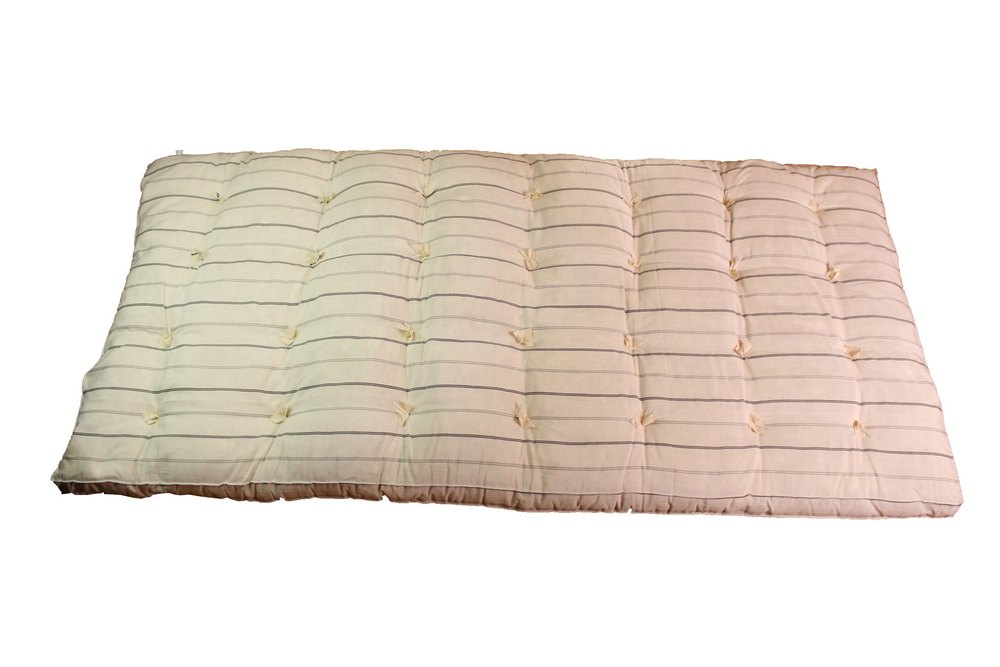 Чехол матраса выполнен из тика - 100% хлопка, что обеспечивает мягкость и комфорт при использовании. Наполнитель из белой ваты на 100% состоит из хлопка, что делает матрас гипоаллергенным и безопасным для здоровья.